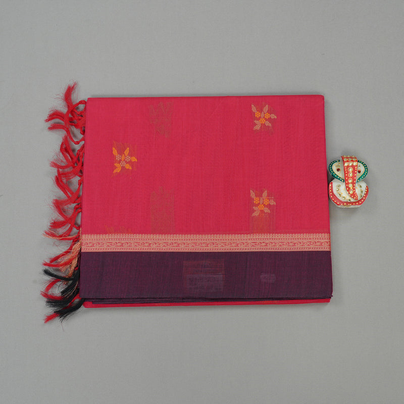 If you love bright, cheerful colours, this pink cotton saree will instantly catch your eye. The saree is vibrant, with small yellow floral thread work adding a playful touch. The plum purple border adds a bold contrast that makes the entire look stand out.