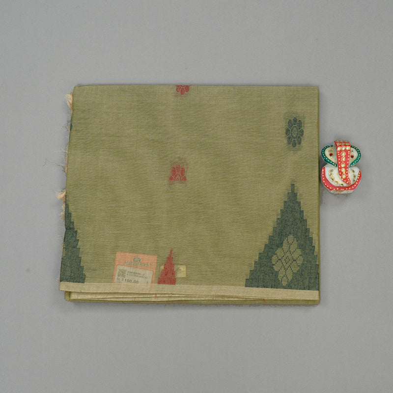 There’s something quietly beautiful about this elaichi green cotton saree. It’s soft, breezy, and has that earthy charm we all love for everyday comfort. The body is plain with tiny flower motifs in muted red and green, giving it just the right pop of colour.