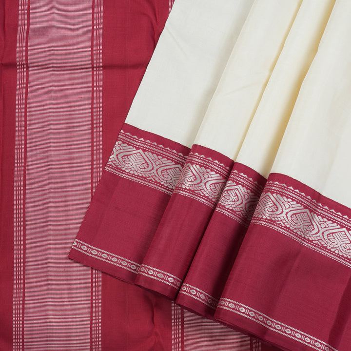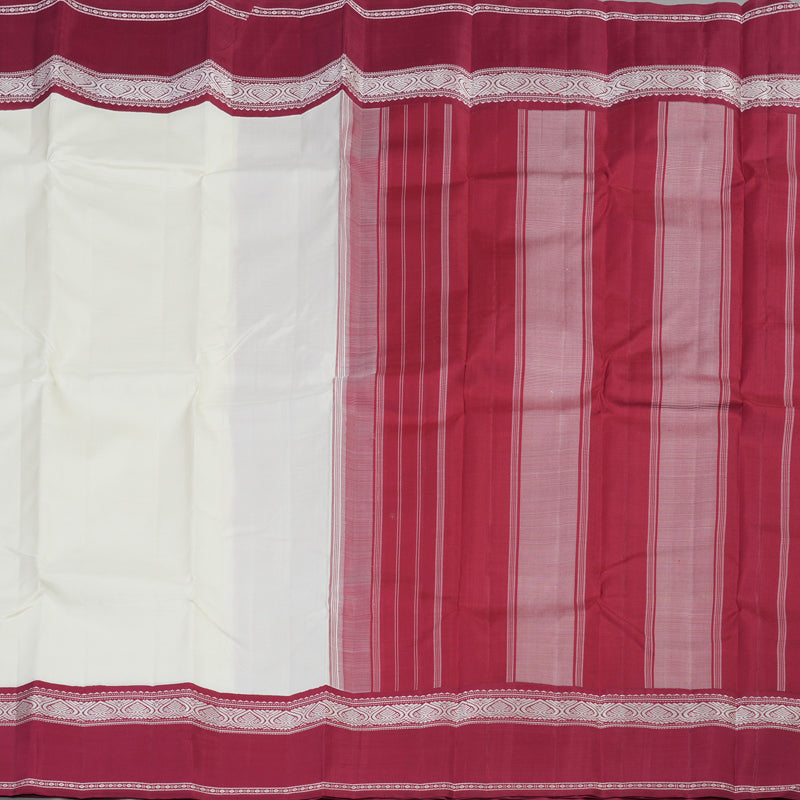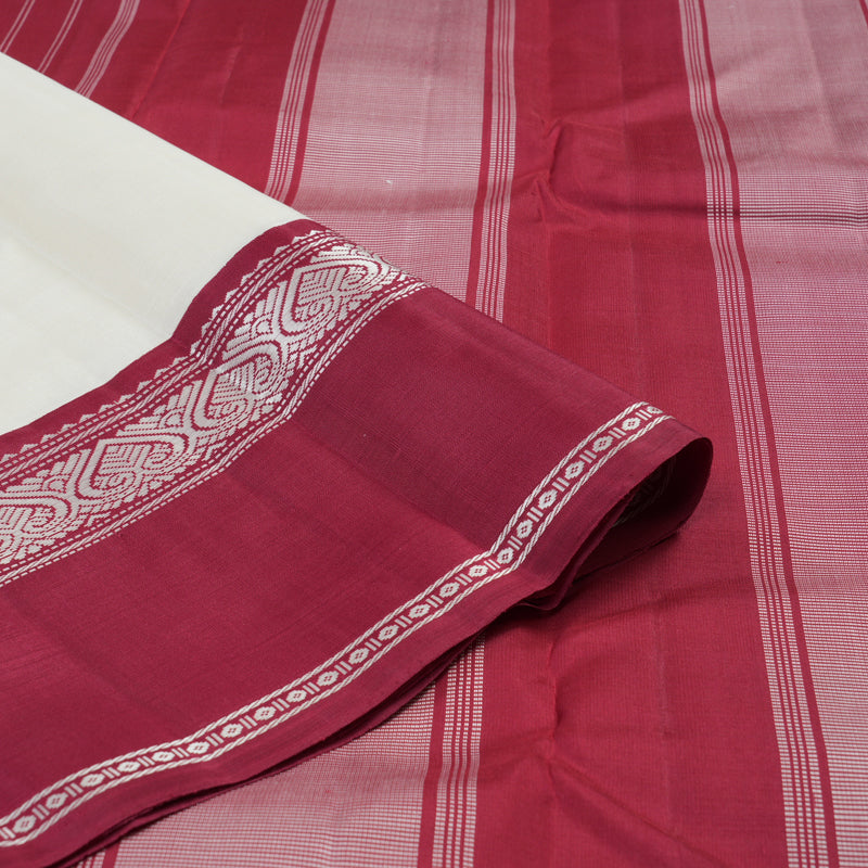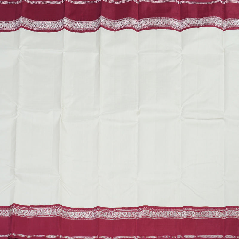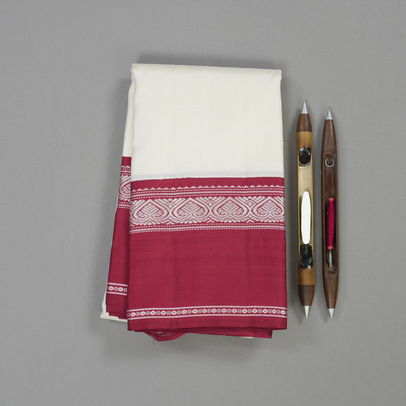 This Kanjivaram silk saree showcases a beautiful half white body that radiates simplicity and charm, while the bold maroon border adds a traditional korvai contrast.