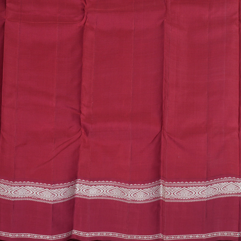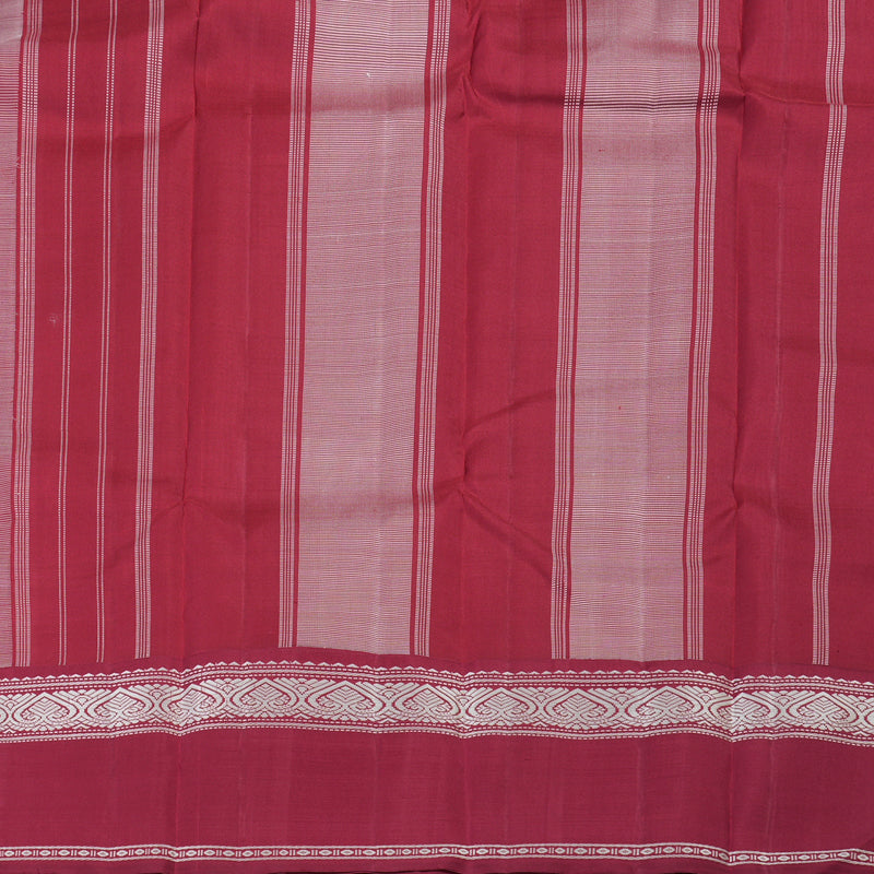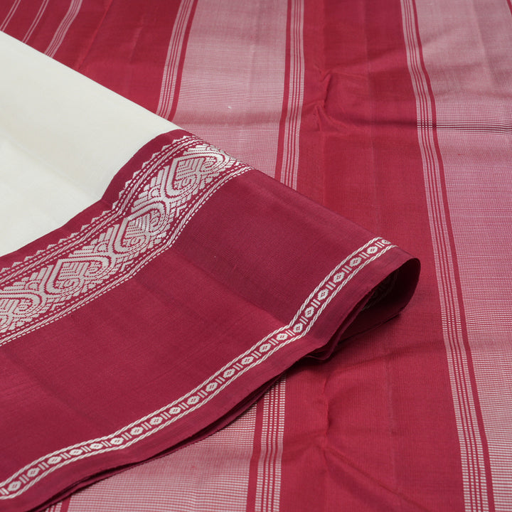 The silver thread detailing along the border and pallu gives it a refined finish. The maroon pallu is designed with vertical striped motifs, lending an elegant touch to the overall look. Paired with a maroon blouse, this saree is perfect for festive occasions, poojas, or intimate celebrations.