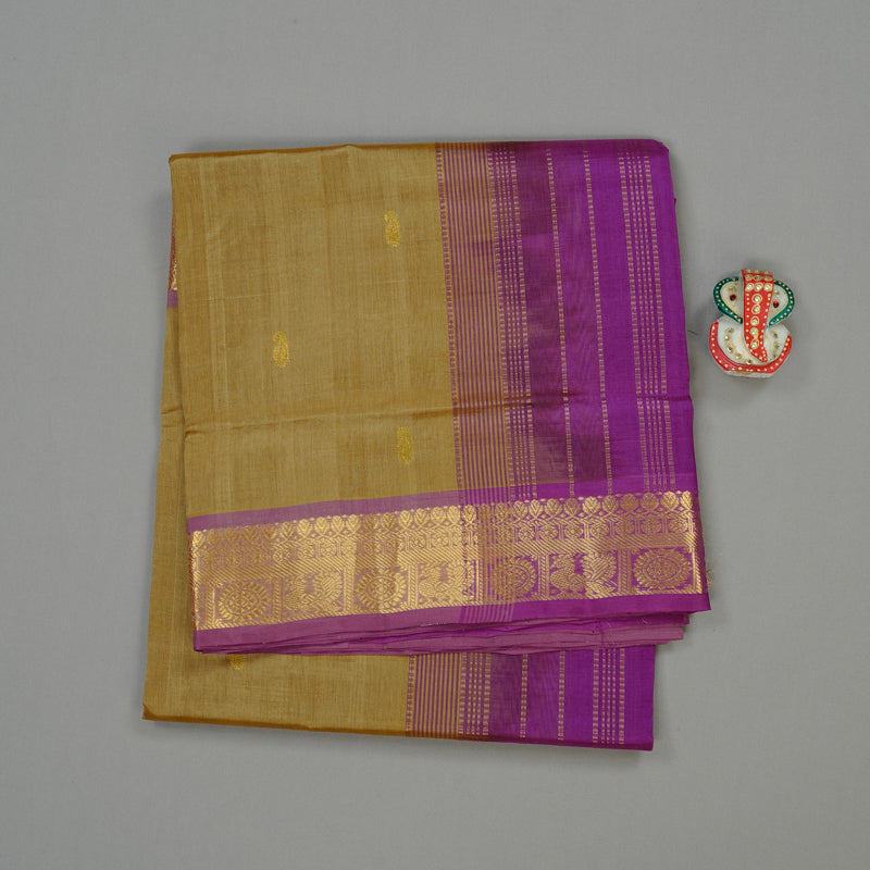 Here’s a soft, elegant choice that can brighten up any traditional gathering — a beautiful beige silk-cotton saree featuring a grand purple pallu and border.