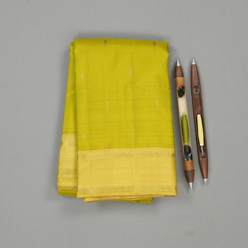 This dazzling handloom Kanjivaram silk saree features a fluorescent green body adorned with subtle Malli mogu jari buttas, lending it a radiant and lively charm. The light golden sandal yellow border and pallu are richly woven with intricate traditional motifs in pure zari, offering a beautiful contrast to the vivid body. The pallu is especially resplendent, showcasing detailed craftsmanship that exudes elegance and grandeur. A vibrant and eye-catching drape, perfect for festive gatherings and ceremonial occasions.