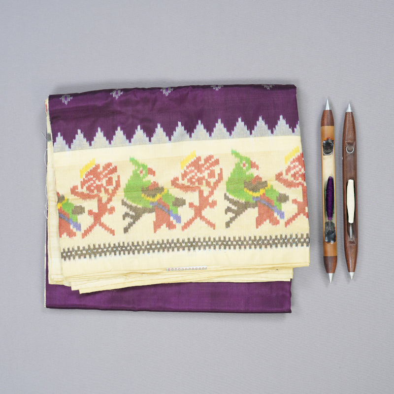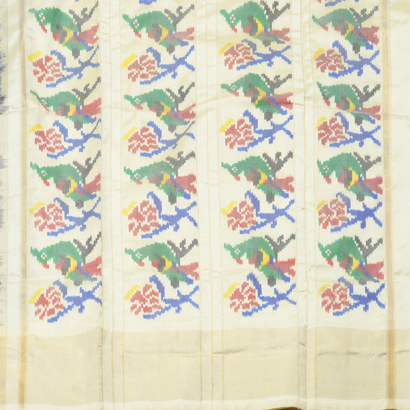 The half-white border creates a striking contrast, making this saree a unique masterpiece. The highlight of the design is the enchanting pallu, adorned with intricate motifs perched amidst vibrant patterns. The vivid hues of green, red, yellow, and blue come together harmoniously.