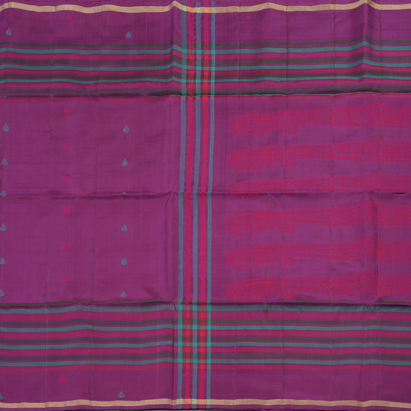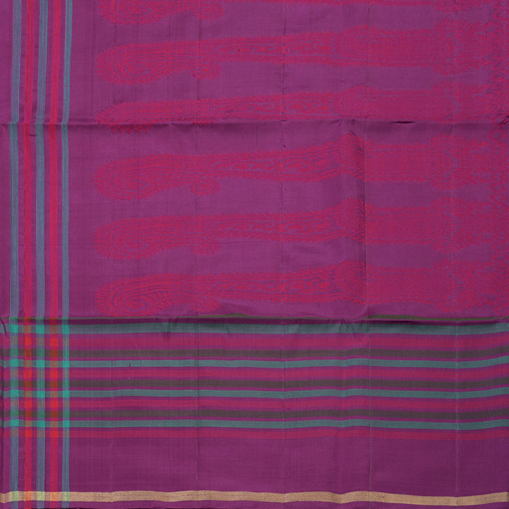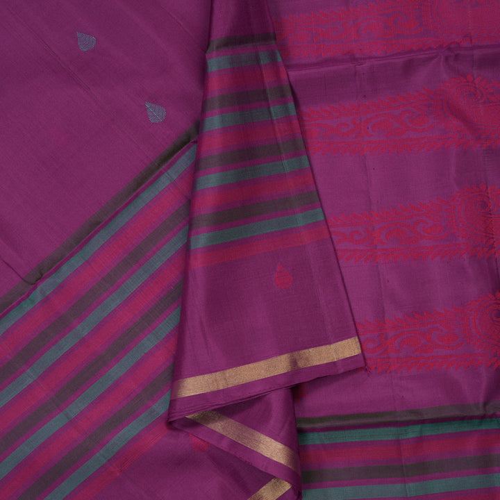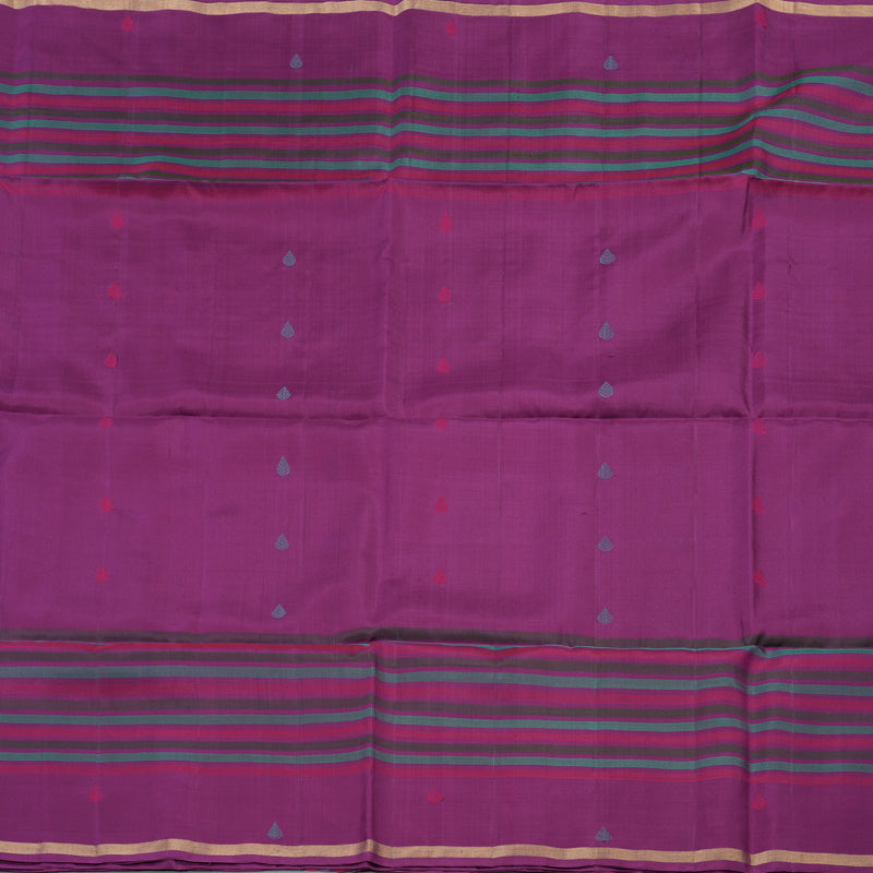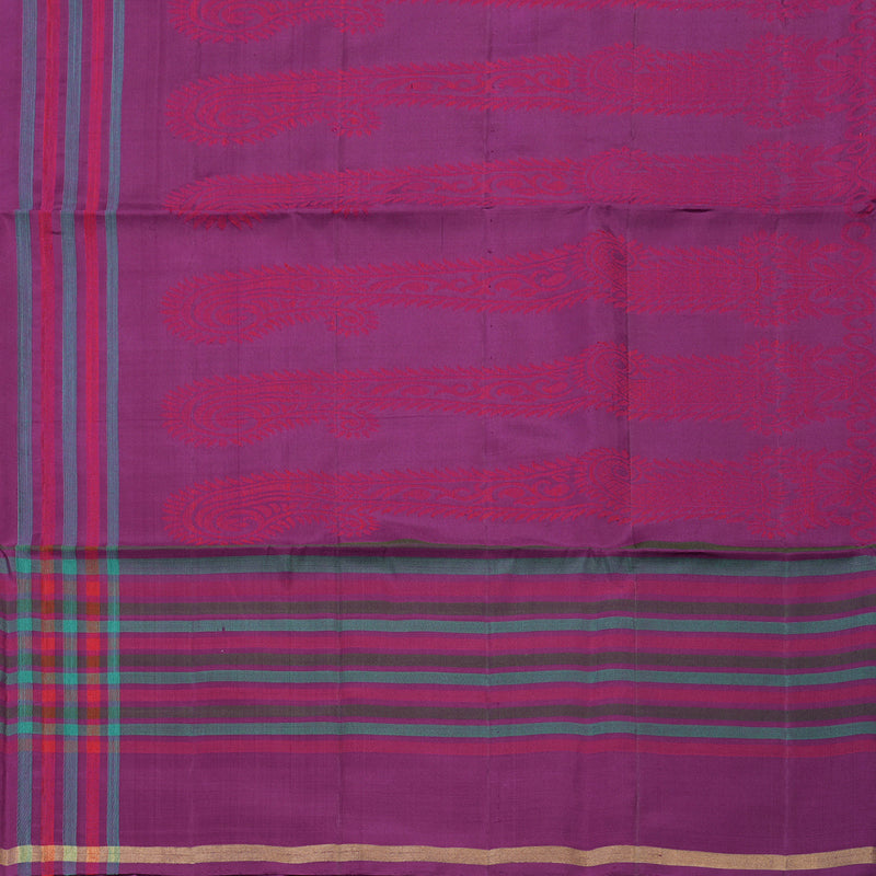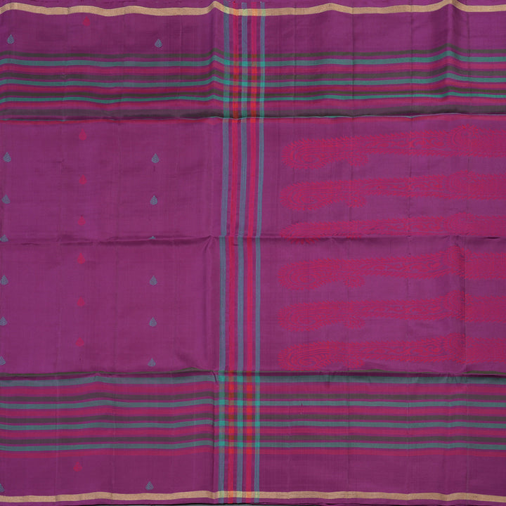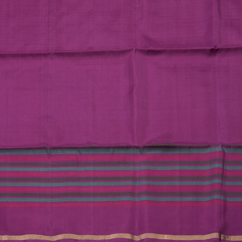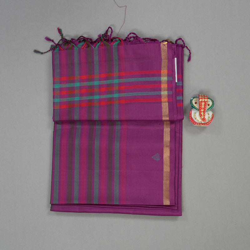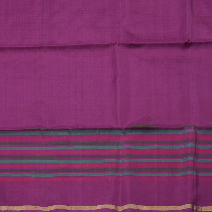 This stunning soft purple silk saree brings richness and vibrancy in a beautifully unified tone. The border continues in the same purple shade, detailed with multi-stripe accents in green and pink, adding a modern twist.