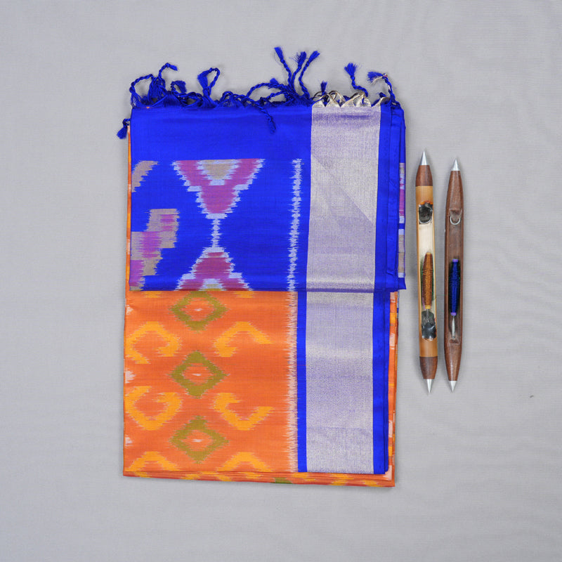 A mesmerising blend of vibrant hues, this rust-orange silk cotton saree is a true showstopper, exuding warmth and grandeur. The rich blue pallu is adorned with floral and geometric patterns, creating a striking contrast that instantly captivates the eye. The detailed motifs add depth, making it a perfect choice for festive celebrations, special occasions, or elegant evening wear.