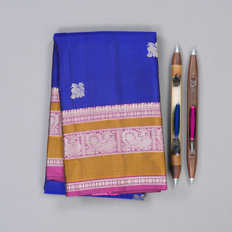 Wrapped in the richness of tradition and woven with a touch of elegance, this stunning blue soft silk saree is a sight to behold. The deep blue hue, adorned with delicate silver motifs, creates an aura of sophistication, making it a timeless piece for any special occasion. The border is a story in itself, seamlessly blending shades of purple and mustard yellow, adding depth and a regal contrast that enhances its beauty.