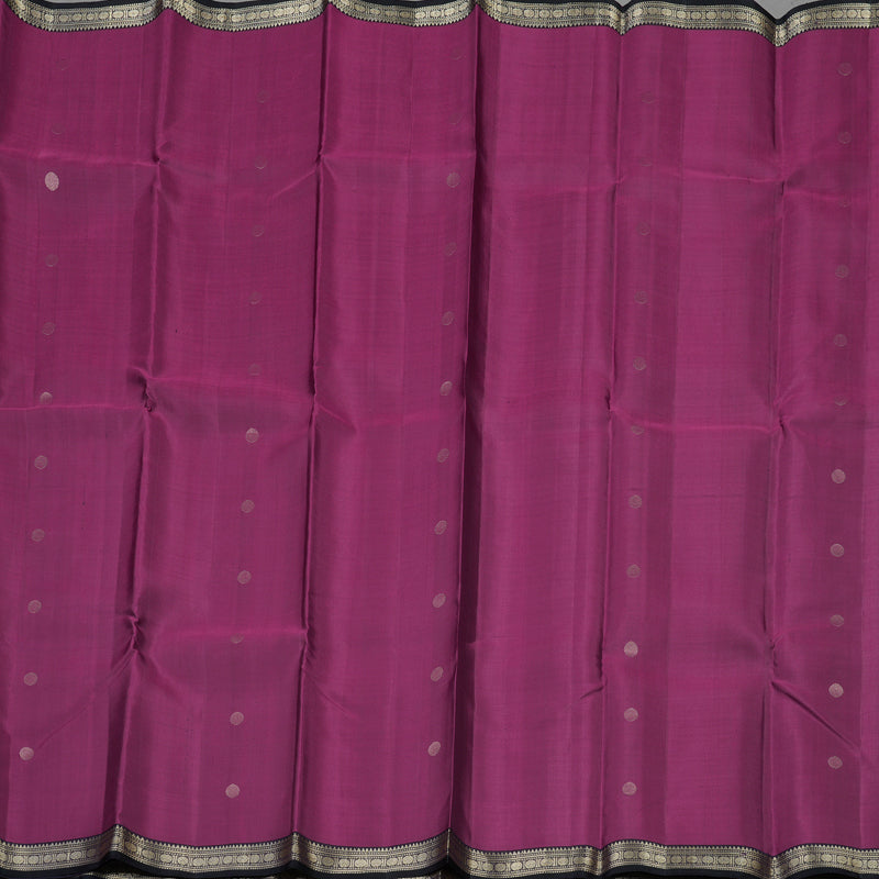 Experience the modern sophistication in this wine magenta Handloom Kanjivaram silk saree, featuring traditional rudraksham motifs woven across the body. This piece is designed with a sleek one-inch border, offering a minimalist and contemporary silhouette that highlights the richness of the silk.
