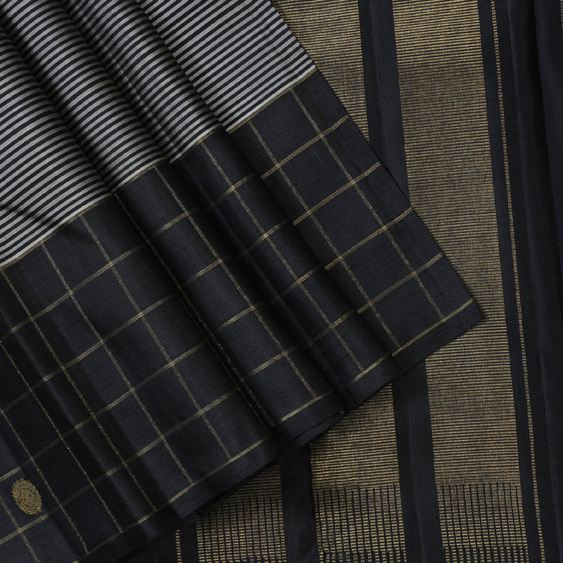 This handloom Kanjivaram Silk Saree grey and black lines on the body. The pattern is uniform and is underplayed. The border has jari checkred pattern with annam and chakra buttas within. This timeless piee of drape is a must in the wardrobe of any kanjivaram passionate.