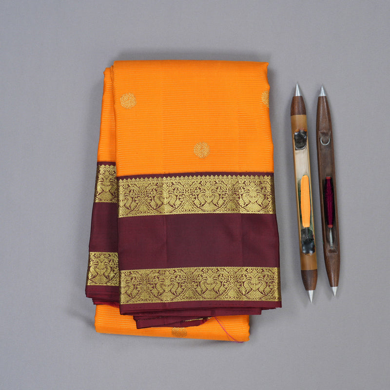 This Orange Kanjivaram Silk Saree is a masterpiece of Vairaoosi weaving, featuring an elegant Wine Maroon Korvai Contrast Border. The intricate Irupakshi motifs on the Retta Pet Border make this saree a rare and distinguished choice.