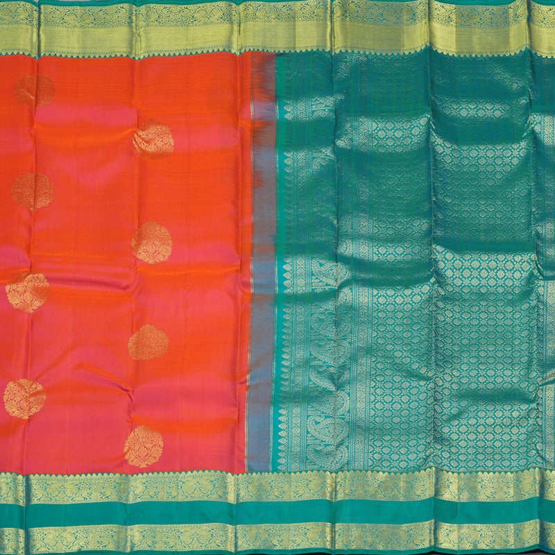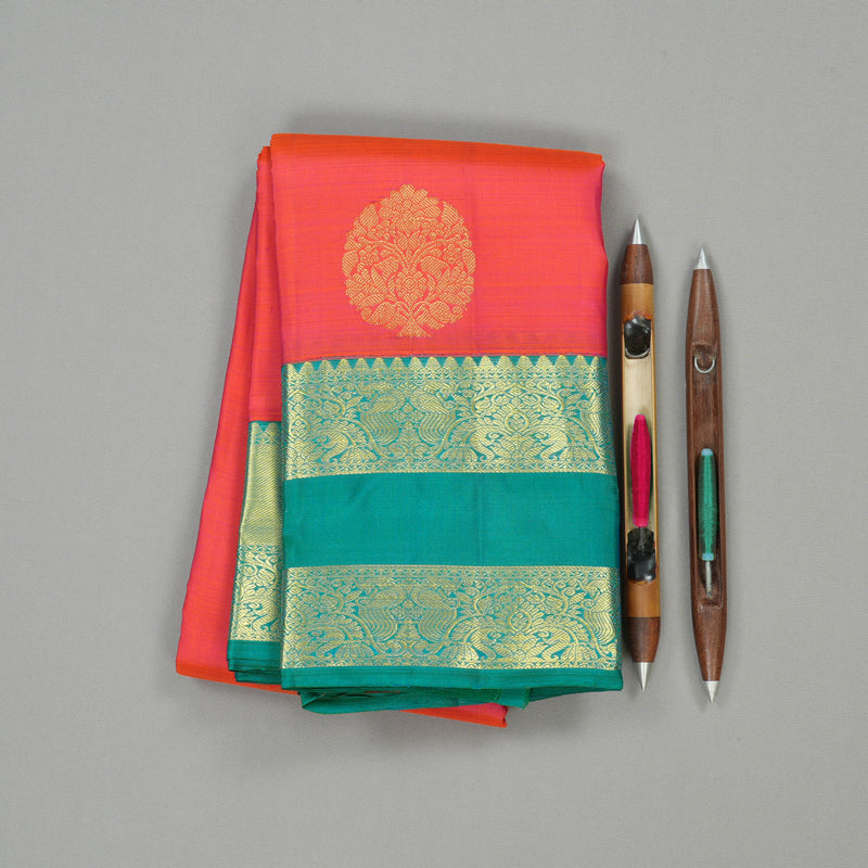 This elegant Orangish Pink Kanjivaram Silk Saree comes with a vibrant Sea Blue Korvai Contrast and a richly detailed Retta Pet Border. Peacock motifs on the border lend traditional charm, while the bold color contrast adds contemporary flair. A festive favorite that bridges past and present aesthetics. Perfect for engagements and traditional events. A vibrant classic in every fold.