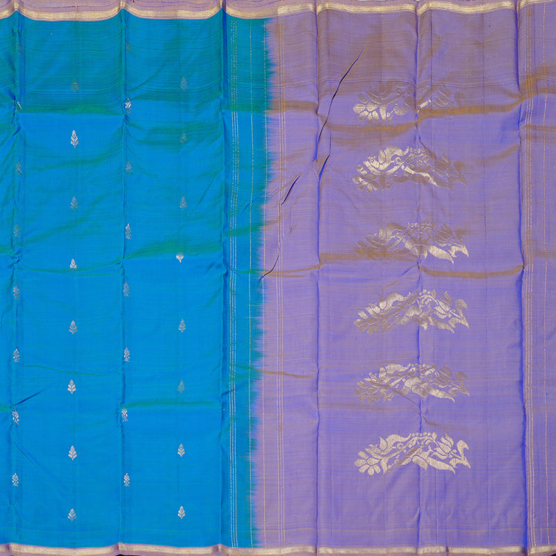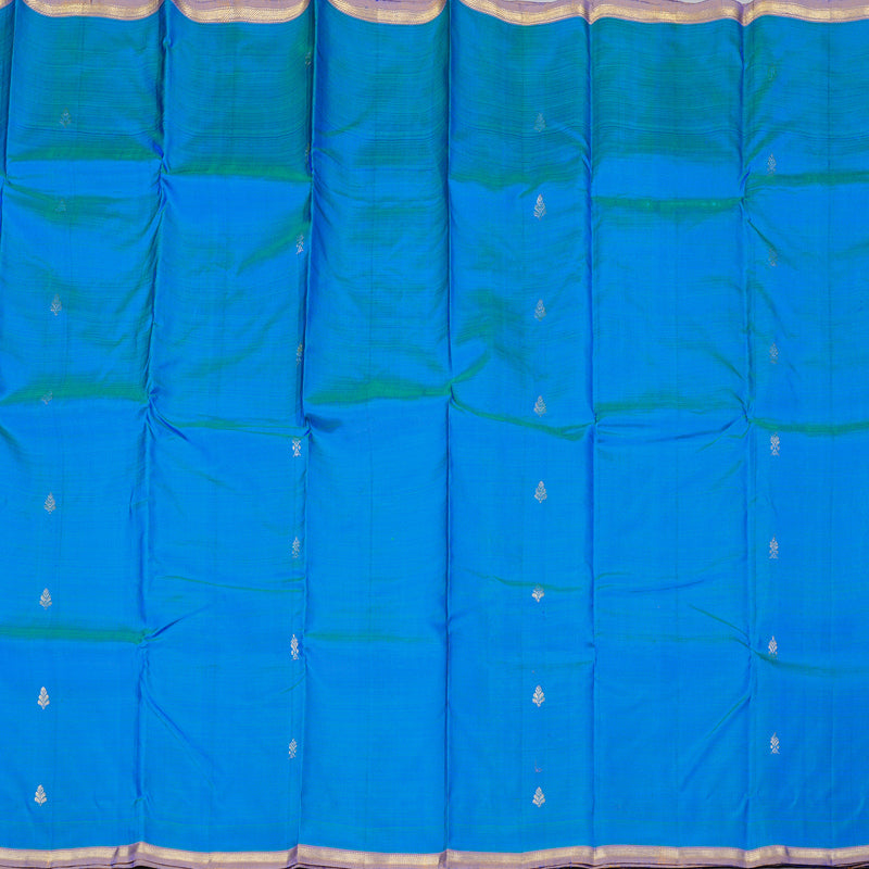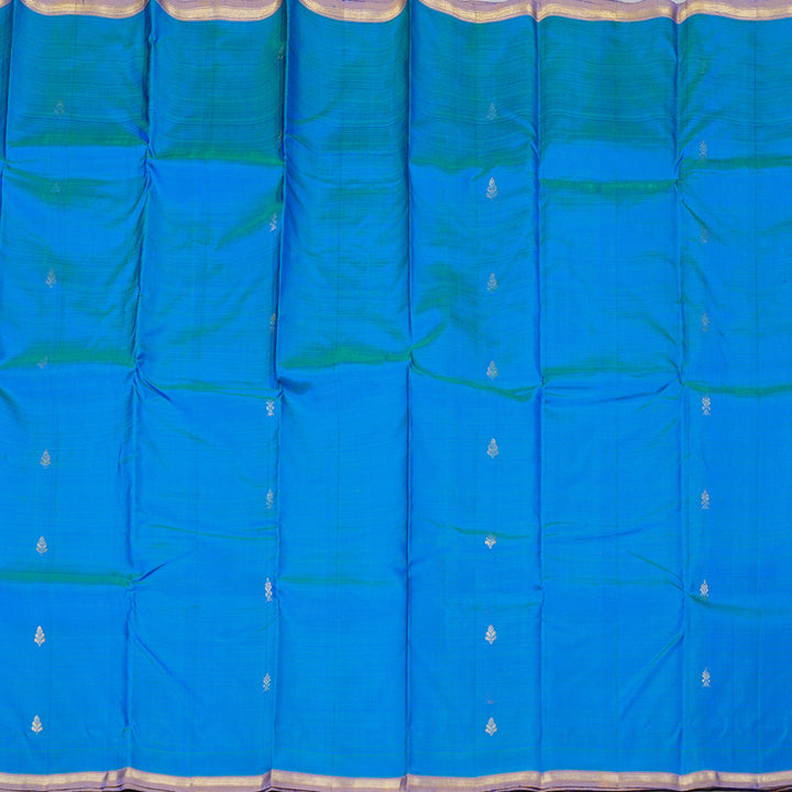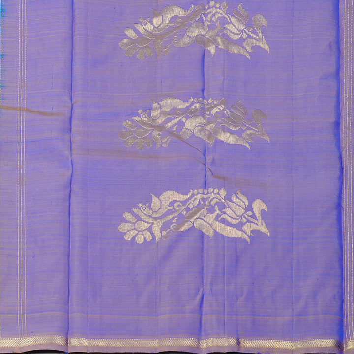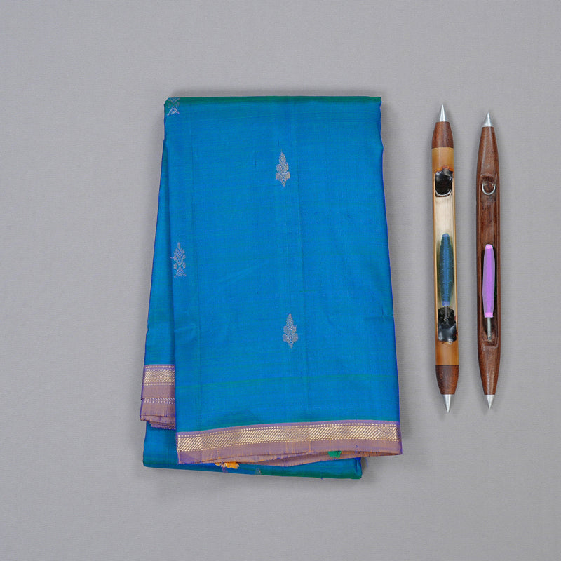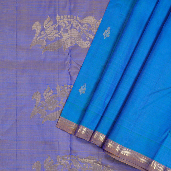 This magnificent Peacock Blue Handloom Kanjivaram Silk Saree is adorned with floral motifs all over the body, reflecting the grandeur of classic Kanjivaram artistry. The stylish border in a dual-tone of blue and yellow adds depth to its rich hues, while the pallu features intricate peacock motifs, symbolizing beauty and grace.