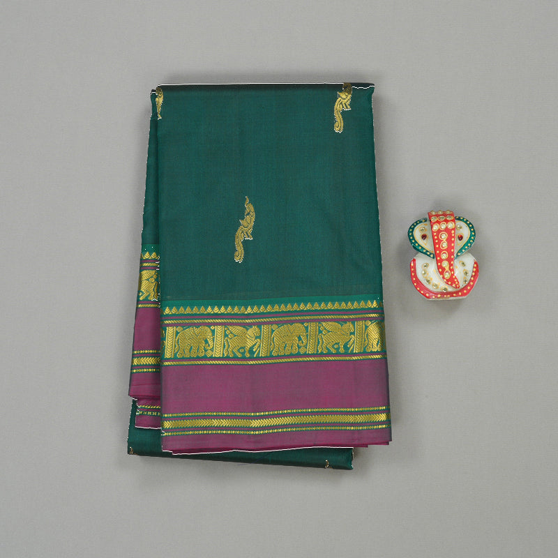 Vivid and traditional, this Peacock Green Kanjivaram Silk Saree is finished with a rich Mandhalir border. The body features exquisite peacock motifs, while the border is adorned with intricately woven horse and elephant motifs. A majestic saree suited for weddings and grand occasions. This design celebrates royalty and the grandeur of temple art. A magnificent drape with a storytelling weave.
