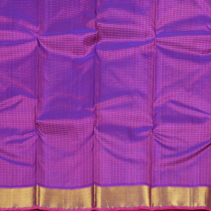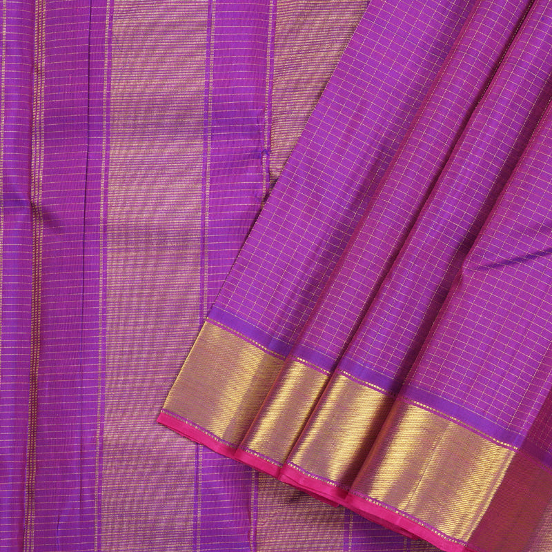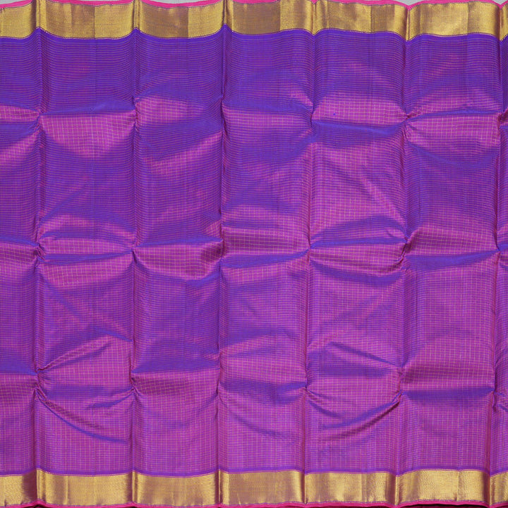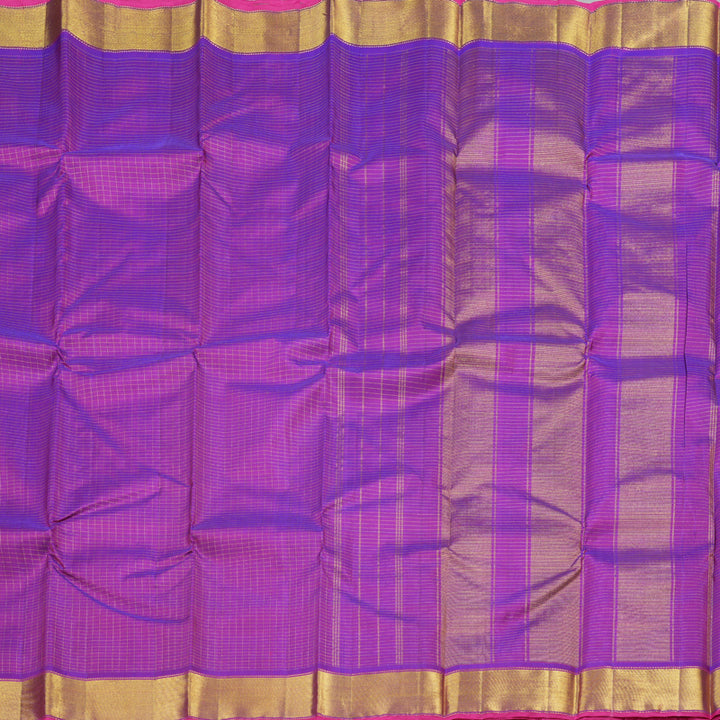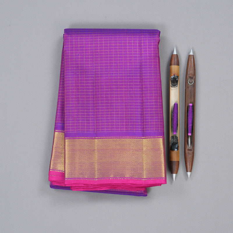 A deep purple vintage Kanjivaram silk saree that exudes opulence with its all-over Jari checks. The rich texture and classic weave make it a treasured addition to any saree collection. Whether for a grand occasion or a festive celebration, this saree radiates elegance and tradition.