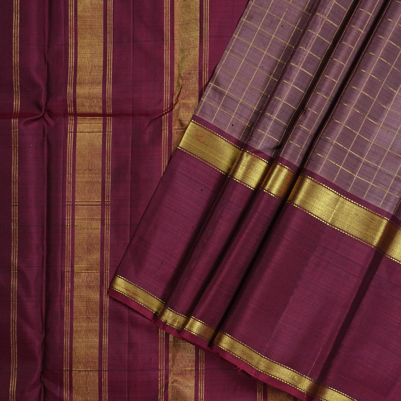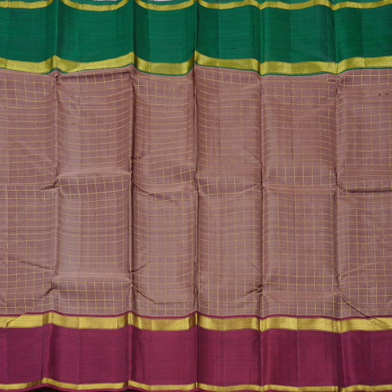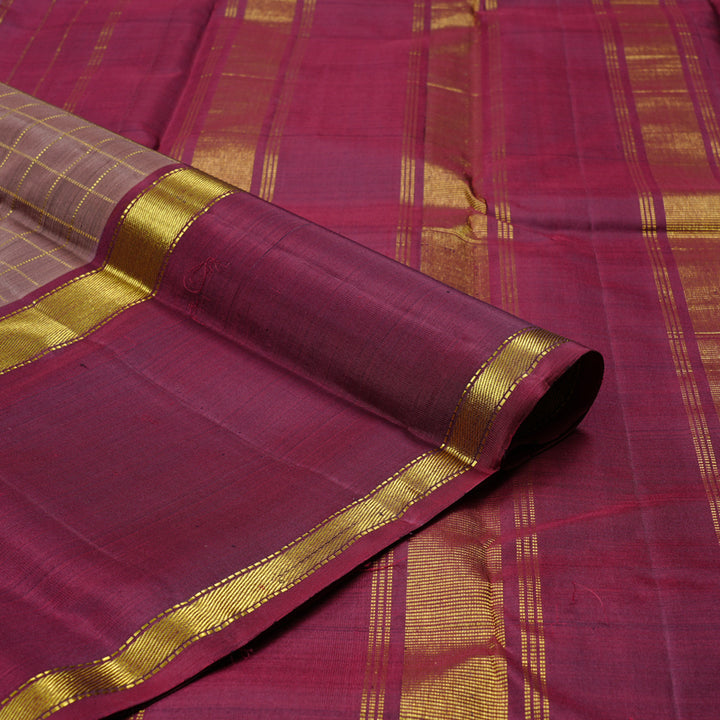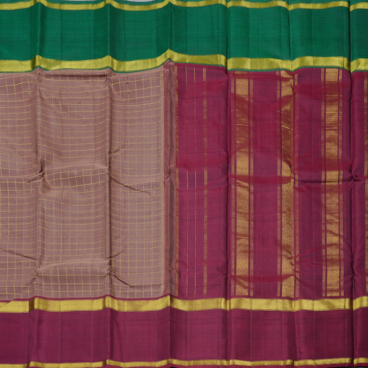 Exuding vintage charm, this Rosewood Pink Handloom Kanjivaram Silk Saree is a mesmerizing tribute to classic craftsmanship. The soft rosewood pink body is complemented by a Ganga Jamuna border in green and maroon, intricately woven with Retta Pet patterns and zari checks for a truly regal look.