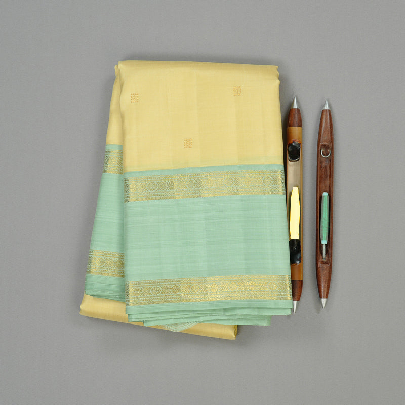 A timeless vintage Kanjivaram masterpiece, this sandal-hued saree features a light pastel green retta pet border in striking korvai contrast. The body is delicately adorned with small buttas, adding a subtle charm. Handwoven from pure silk, it exudes elegance perfect for traditional events and ceremonies. The pastel border adds a soft yet elegant finish to this heritage weave.