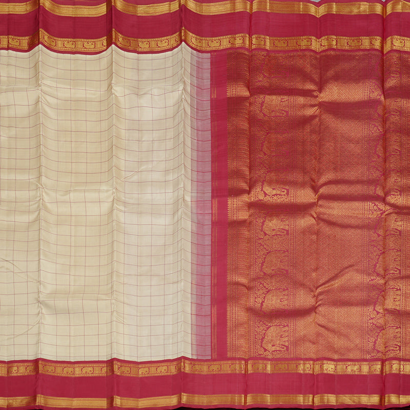 Revel in regal tradition with this Hayagrivas Sandal Kanjivaram saree adorned with delicate thread checks across the body. The maroon korvai border comes alive with majestic elephant motifs, symbolizing strength and prosperity, while the pallu echoes this grandeur with complementing designs. Handwoven using time-honored techniques, this pure silk saree stands as a celebration of Southern craftsmanship—ideal for wedding rituals and cultural festivities.