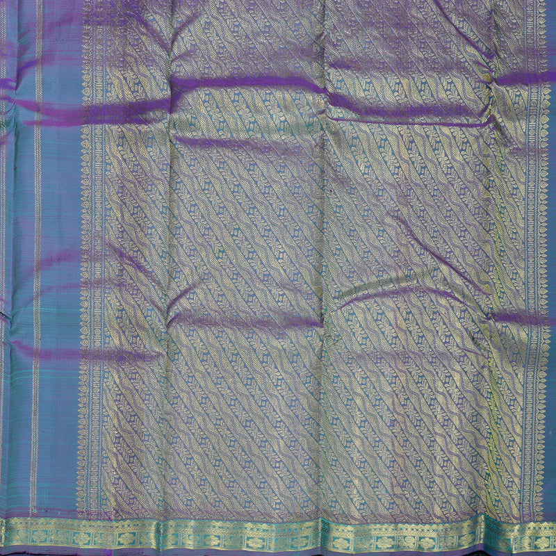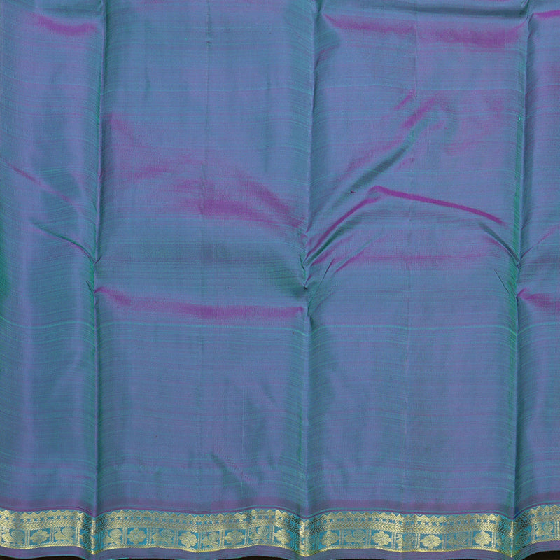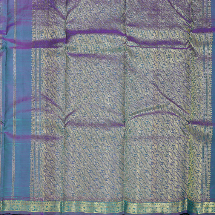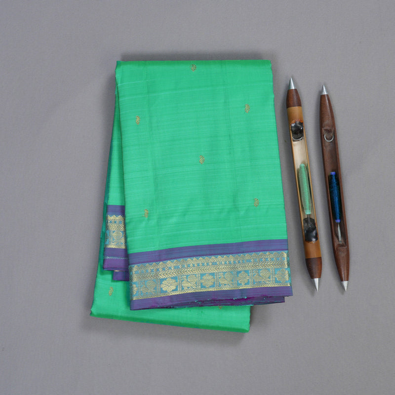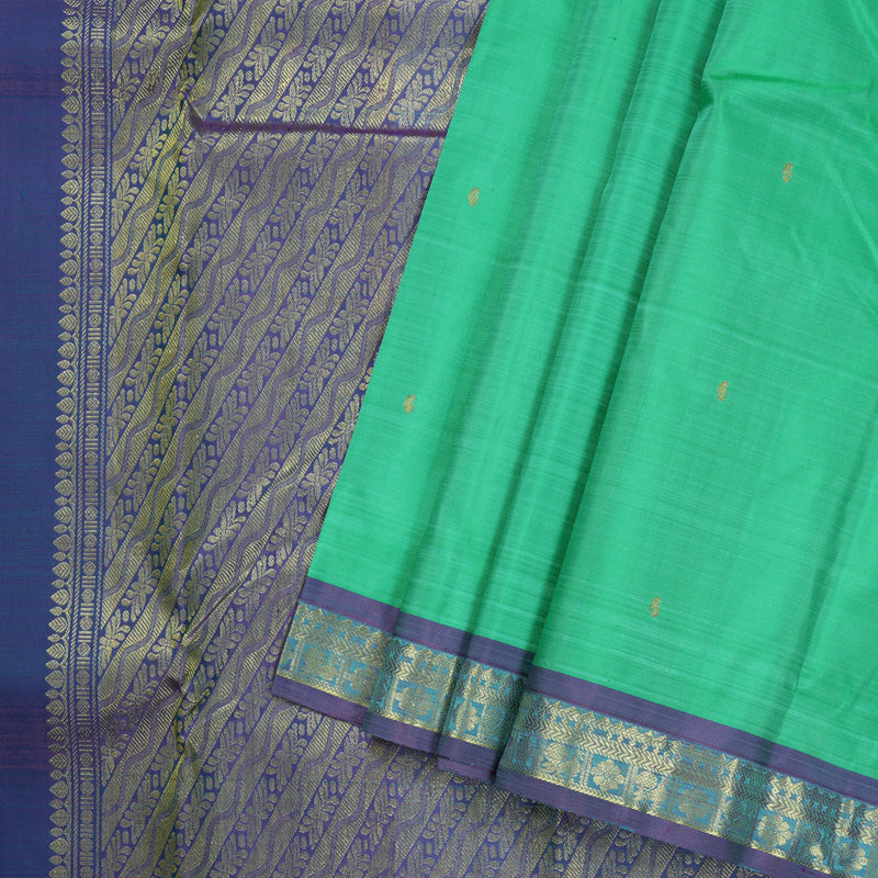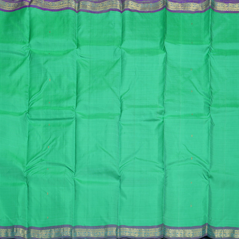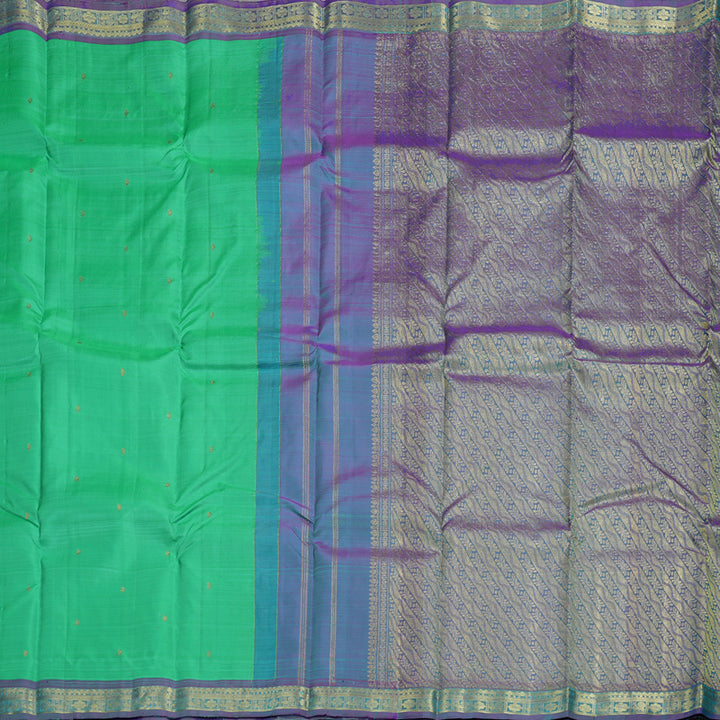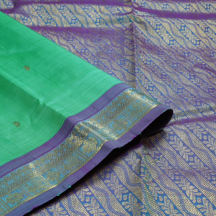 Exuding charm and elegance, this sea green Kanjivaram silk saree features a regal purple border. A delightful choice for traditional occasions, it complements gold or pearl jewelry beautifully.