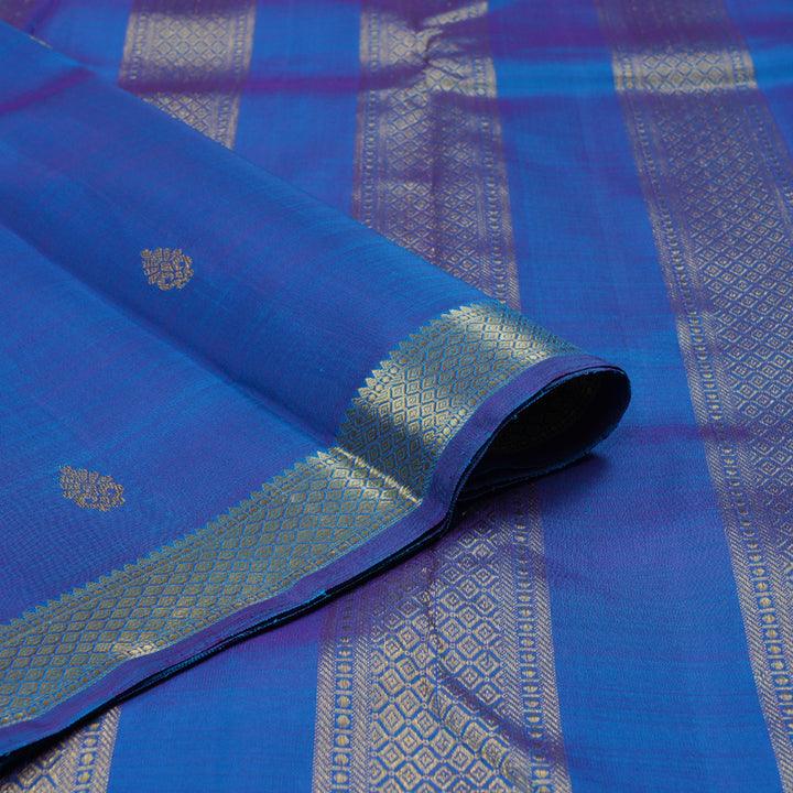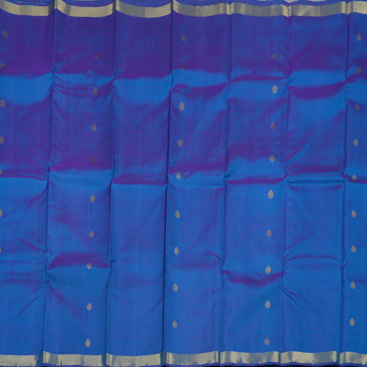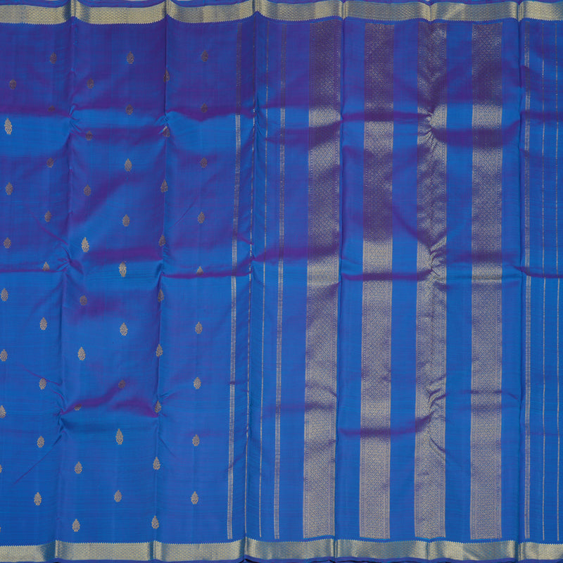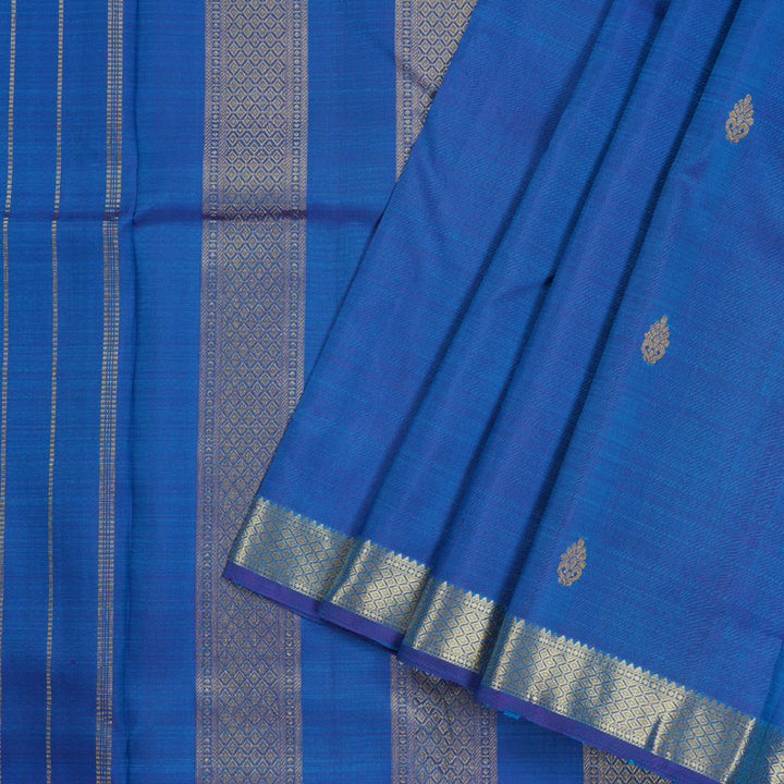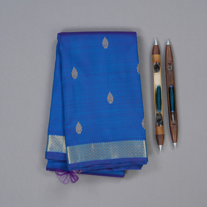This vintage-style blue Kanjivaram is woven with intricate buttas across the body, exuding an air of classic sophistication. A perfect blend of tradition and charm.