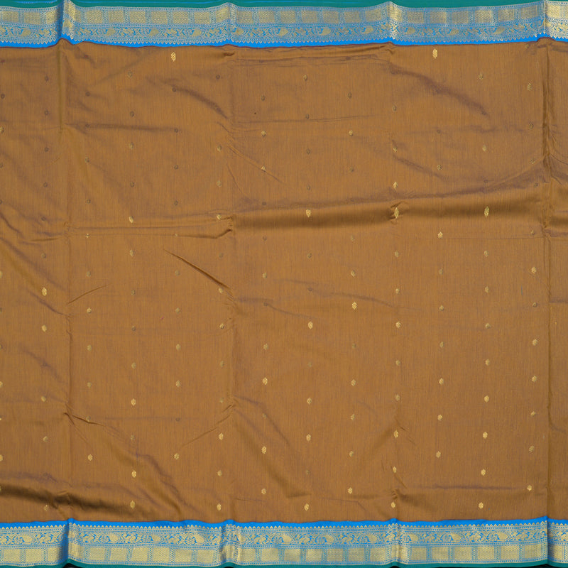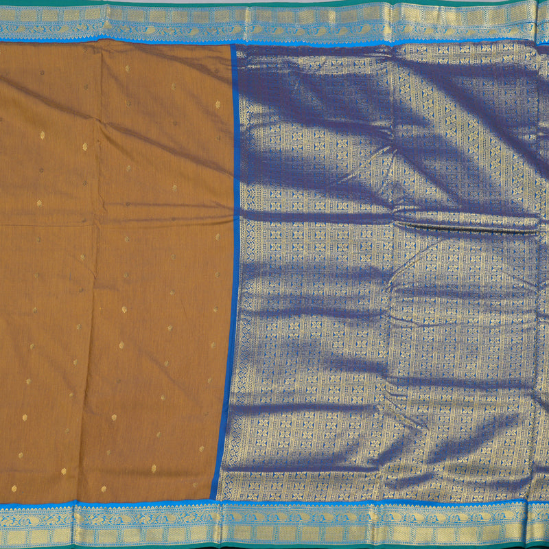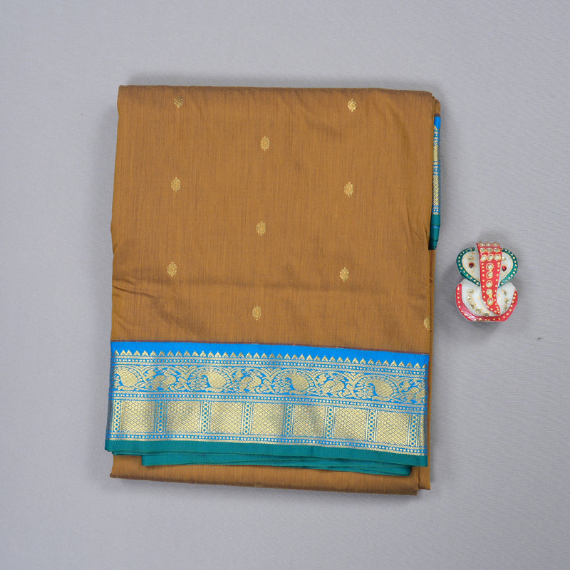 The sky blue border and pallu add a beautiful contrast, bringing a fresh and lively touch to the muted Hayagriva's Ten Yards Semi Silk Saree In Soft Mustard brown. Delicate golden motifs are sprinkled across the saree, adding just the right hint of shimmer. The rich blue pallu, woven with intricate gold patterns, flows gracefully, making every movement look regal.