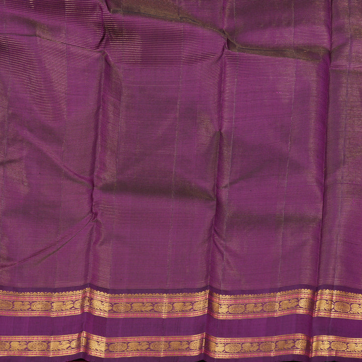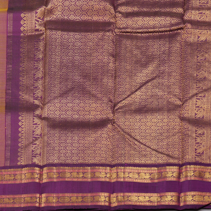 This bright yellow Korvai Vairaoosi Kanjivaram is a showstopper, featuring intricate peacock motifs on the Retta Pet border in deep purple. The contrast border enhances the vibrancy, making it an excellent choice for haldi ceremonies and festive gatherings. Style with antique gold accessories and a soft braid for a traditional yet striking look.