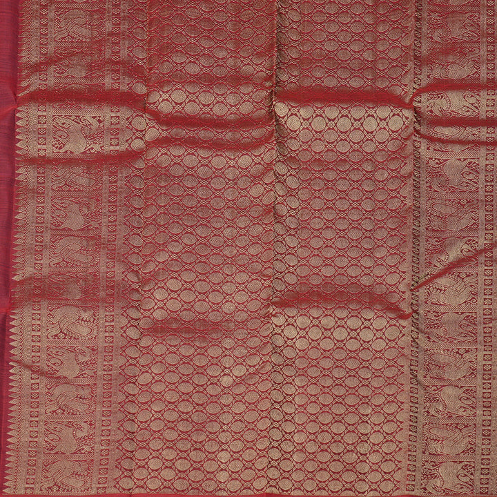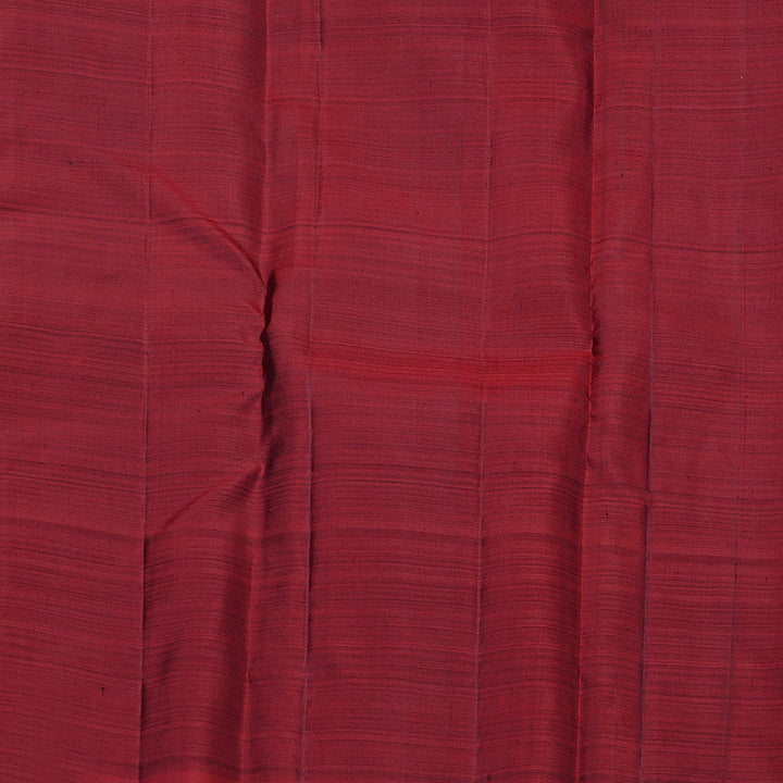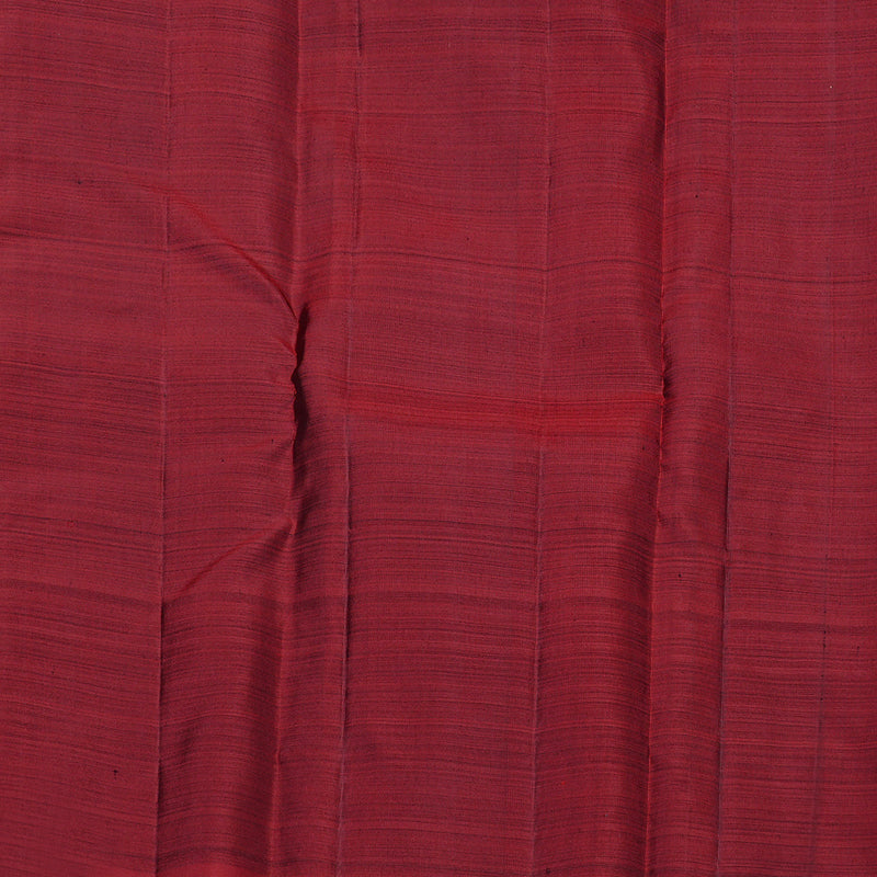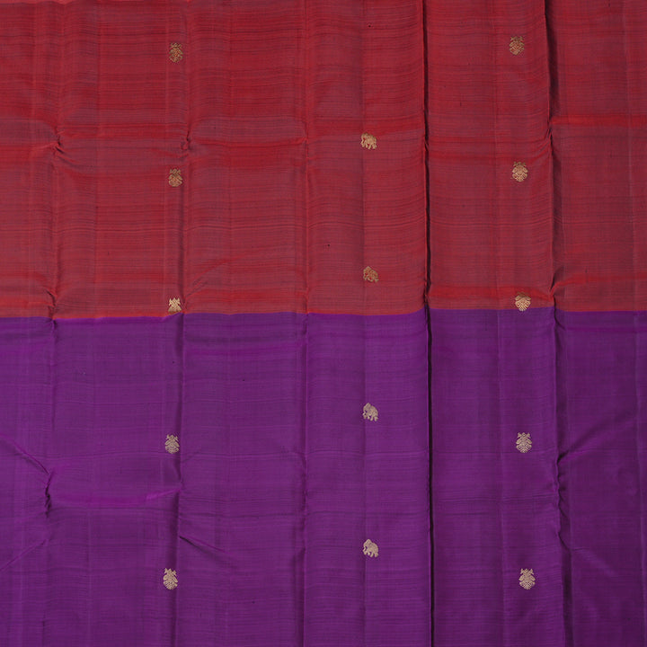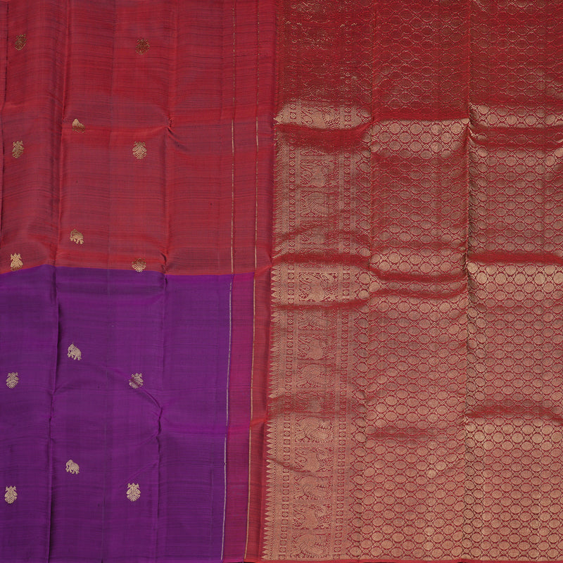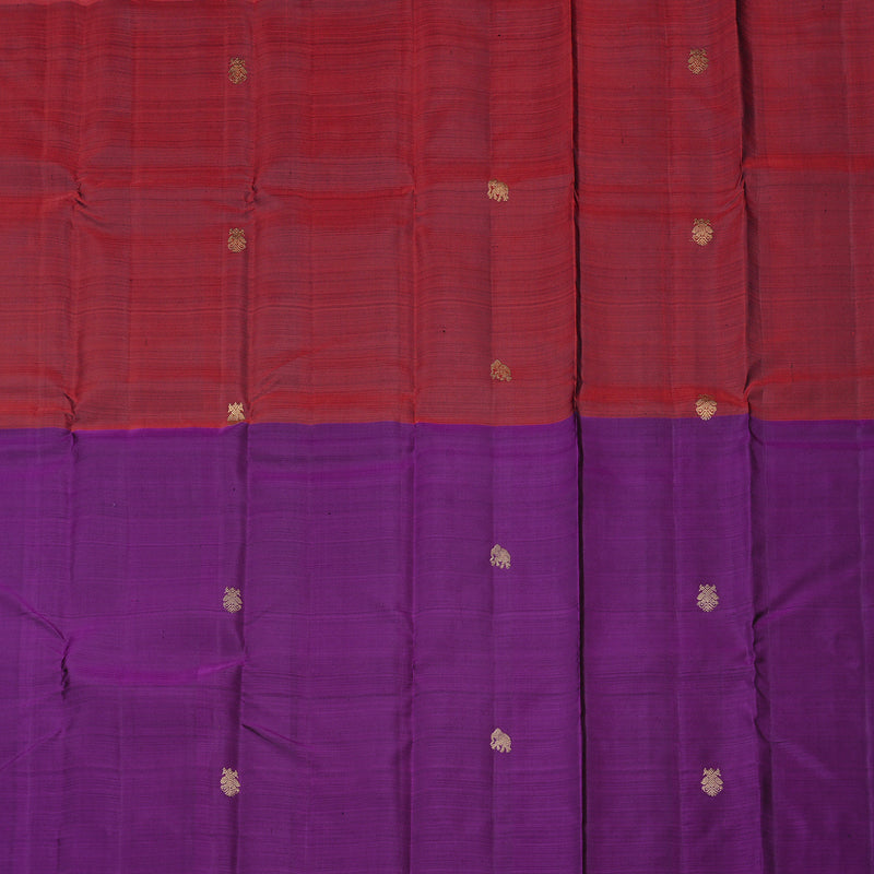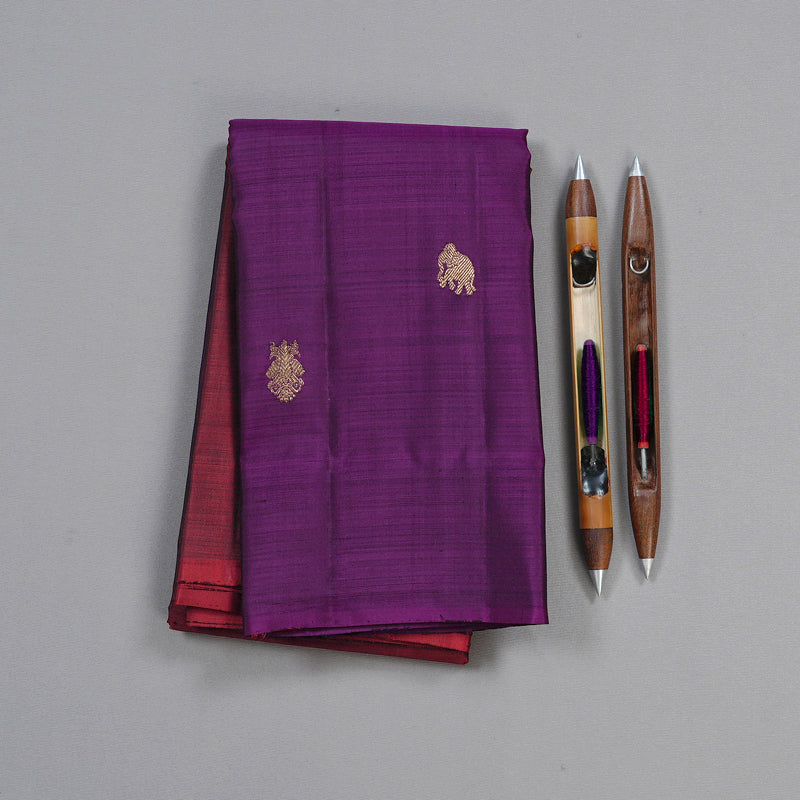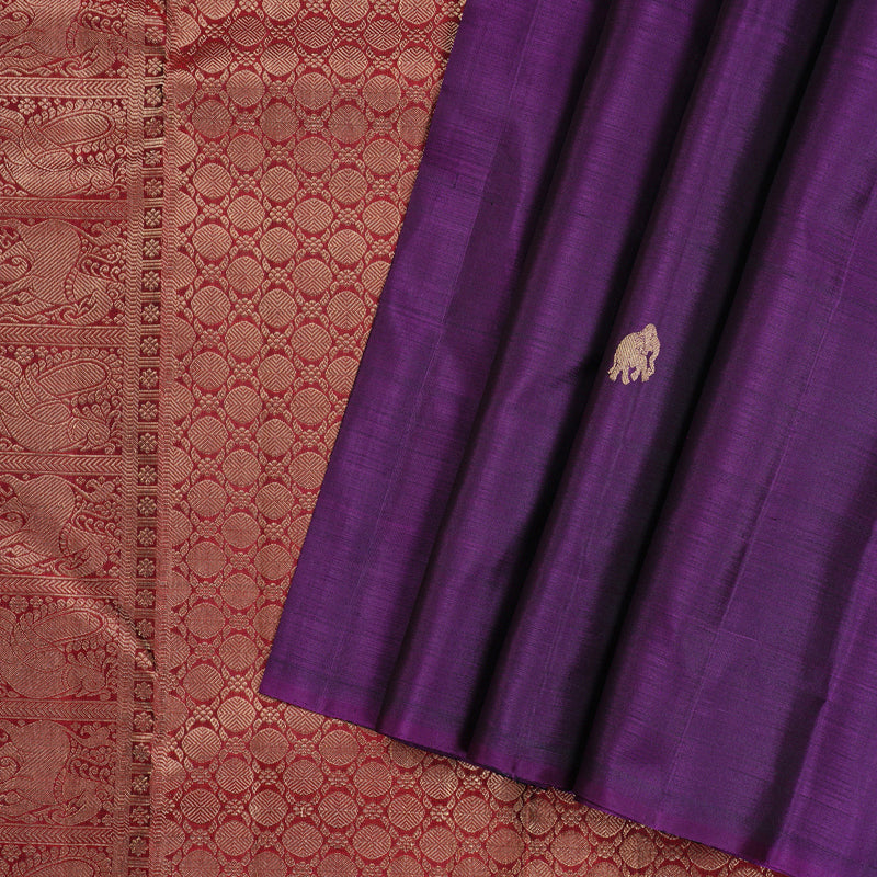 Steeped in tradition, this Wine Maroon and Purple Handloom Kanjivaram Silk Saree is an ode to classic heritage. The deep, rich tones of maroon and purple create a regal look, while the elephant and Iru Pakshi motifs across the body symbolize prosperity and harmony.
